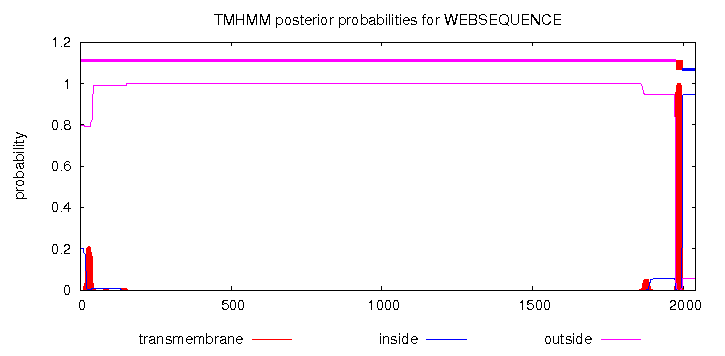 Uma vez estudada a localização celular, procedeu-se à análise da existência de domínios transmembranares na proteína. Com este objetivo recorremos à ferramenta indicada pelo docente, o site TMHMM2.0.
